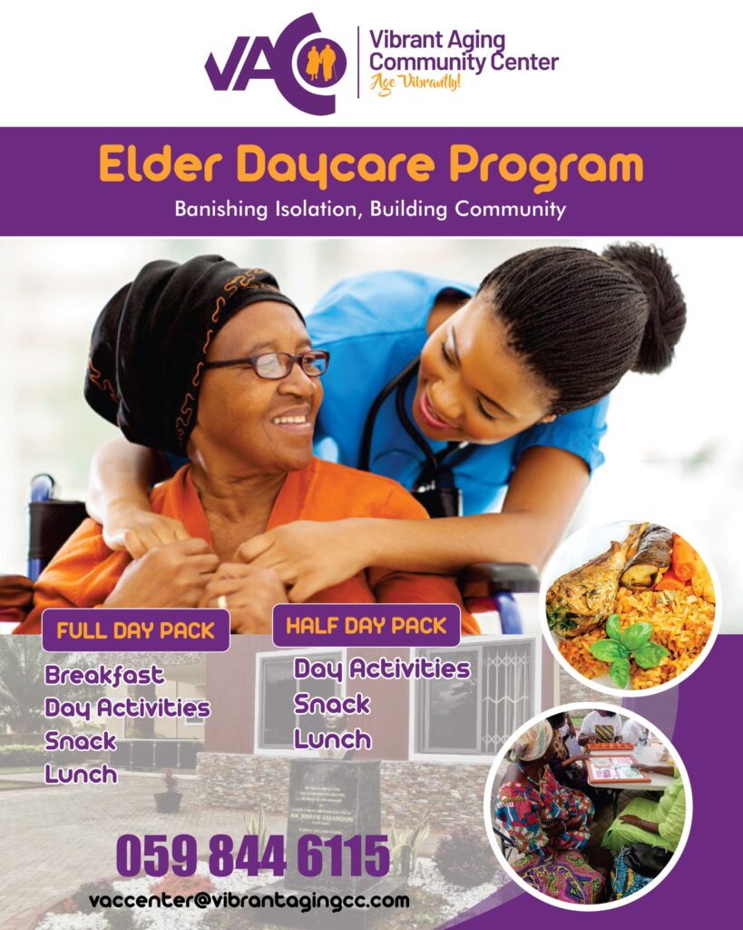 Akwaaba! to Vibrant Aging Community (VAC) Center, an assisted living facility in Ghana, where you are valued, encouraged, supported, and celebrated. Aging is a gift that comes with its own unique life changes. We can’t stop the march of time or the aging process and the losses that may come with it. We can, however, help you experience a vibrant and quality life in older age here at Vibrant Aging Community (VAC) Center.